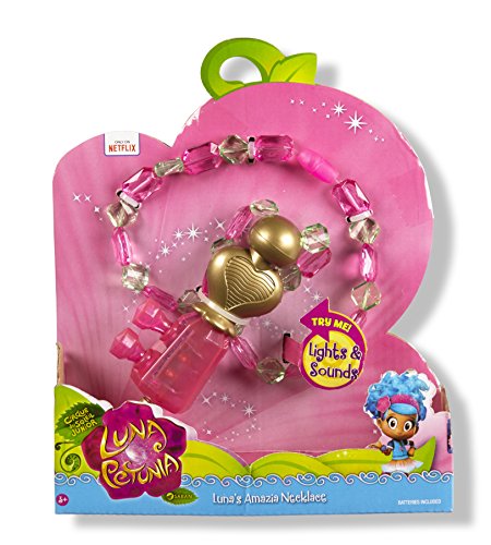 In Amazia, Luna uses her special necklace to call Zoomshine and to open the door to Petunia Manor. Push the gem buttons on this Sparkle Gem Necklace and watch as it lights up and makes magical sounds just like Luna’s necklace does in the show! Appropriate for ages 3 and up.Feature