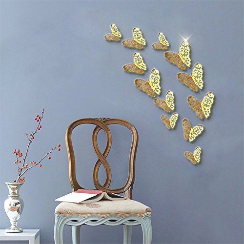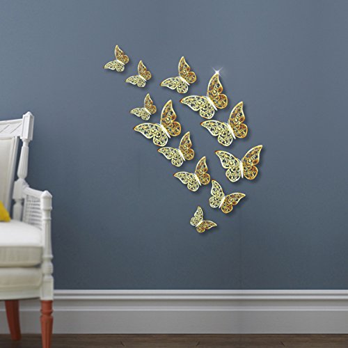 FLY SPRAY Gold Butterfly Mural Decor 36pcs Removable Hollow-out Wall Stickers with Adhesive Glitter DIY Decals Decoration Exquisite 3D Crafts