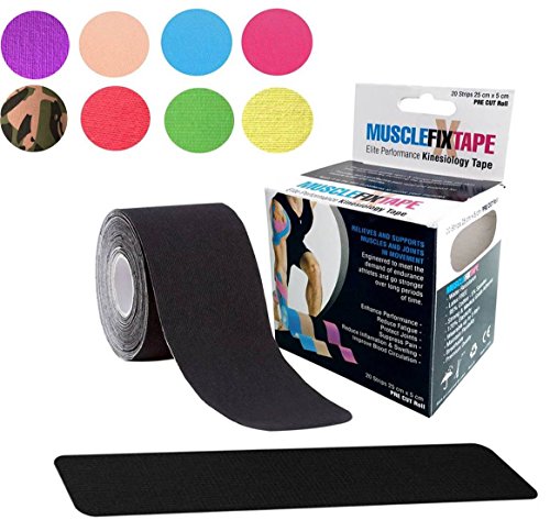 20 STRIPS 25cm x 5cm / 10in x 2in OF PREMIUM QUALITY & ENHANCING PERFORMANCE KINESIOLOGY RECOVERY PRECUT TAPE: Muscle Fix Tape lifts your skin away from muscles increasing the blood circulation, providing fast and effective pain suppression and relief, joint protection, fatigue reduction and support for muscles, ligaments and tendon aches and injuries. Ideal for shoulder, neck, elbow, lower back, knee, ankle and many others. FDA, CE and ISO Certified.