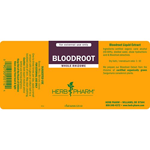 ReleaseDate : 2013-08-16 Studio : Herb Pharm Publisher : Herb Pharm Binding : Health and Beauty Product Description We prepare our Bloodroot Extract from the rhizome of Sanguinaria canadensis plants which are Certified Organically Grown in their natural forest habitat in eastern Kentucky. To assure optimal extraction of Bloodroot's bioactive compounds, the rhizome is hand-harvested in summer or autumn, is carefully shade-dried, and is then thoroughly extracted. Caution: Seek expert medical advice before taking during pregnancy. Do not take drops undiluted or exceed recommended dose. For external use only. 0