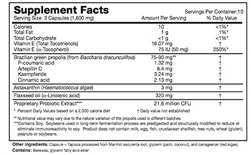 Suggested Use As a dietary supplement Take three capsules daily with water one in the morning, one in the afternoon, and one in the evening. Take the suggested dosage for 21 days, refrain for seven days, and then repeat. Or use as directed by your health care professional. (Children under age 6 1 capsule daily at bedtime). For best results, take on an empty stomach. Refrigeration not required. - Or as directed by your healthcare professional. Supplement FactsServing Size: 3 Capsules (1800 mg)Servings Per Container: 10Amount Per Serving% Daily Value***Calories10Total Fat1 g1%Total Carbohydrates less Than1 gVitamin E (Total Tocotrienols)16,07 mg*Vitamin E (a-Tocopherol)75 IU (50 mg)250%Brazilian green propolis (from Baccharis dracunculifoia)90 mg*P-coumaric Acid1.32 mg*Artepillin C8.4 mg*Kaempferide3.24 mg*Cinnamic Acid2.13 mg*Astaxanthin (Haematococcus algae)3 m 0 |