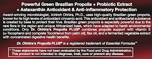 Studio : Essential Formulas Publisher : Essential Formulas Binding : Health and Beauty Product Description Dr. Ohhiras Propolis PLUS 30 VegCapProduct Description Award winning microbiologist, lichiroh Ohhira, Ph.D., uses high-quality Brazilian green propolis, known for its high levels of antioxidant cinnamic acid. This antioxidant and antibacterial substance is created by bees to protect their hive. Brazilian green propolis is especially powerful due to the rare flora in the region and unique Africanized bees, which have adapted to harsh environmental conditions. Only Dr. Ohhira's Propolis PLUS combines propolis support with vitamin E (a-Tocopherol and complete Tocotrienol from palm oil), flax oil, and a fermented vegetable extract with concentrated digestive health benefits. Dr. Ohhira's Propolis PLUS contains only select Brazilian green propolis (carefully removed from honey bee hives using a water soluble extraction method), blended with Dr. Ohhira's nutritious fermented vegetable extract, highly absorbent astaxanthin extracted from valuable Haematococcus seaweed, antioxidant vitamin E, and flax seed oil, one of nature's richest source of Omega-3 fatty acids.