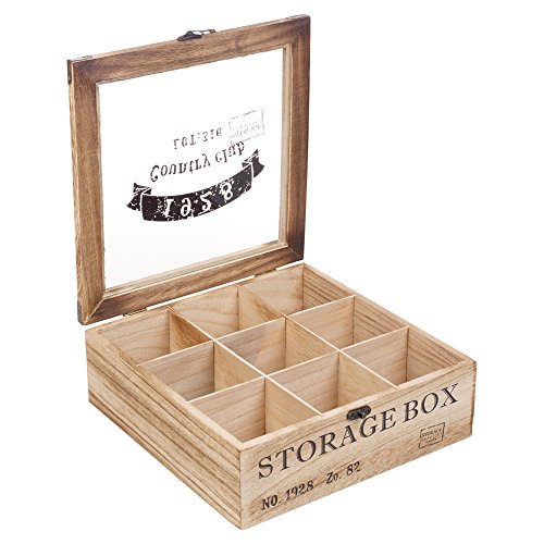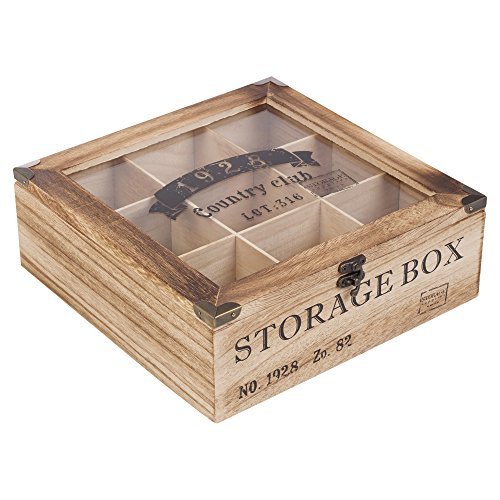 Studio : EG Homeware Publisher : EG Homeware Binding : Kitchen Product Description Tea lovers, you have met your perfect storage solution! Store your tea stash in this sturdy burned wood tea box. It contains 9 or 6 compartments, a glass lid for viewing your personal selection and retro design printed on box and lid for extra effect. For those who have other ideas, put your food, spices and knick-knacks into this reliable and lightweight container. 0