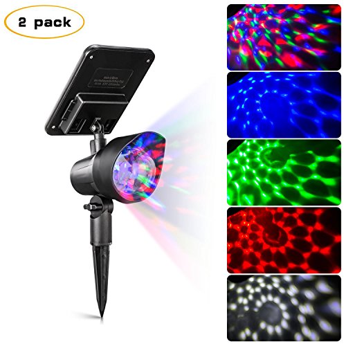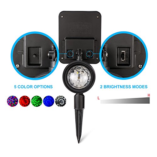 -. Feature : Fantastic Light - 4 bright LEDs create 5 different color light shows-The rotary spot lights create a magic fairy tale sense for garden, party, weddings or snowy Christmas / Adjustable Light & Solar Panel - Adjust the solar party light angle to illuminate the perfect spot and adjust the solar panel angle for optimum sun exposure / Long Working Time - Built-in 18500 3.7V 1200mAh lithium rechargeable battery, it can light up 8-10 hours after fully charged. / Indoor & Outdoor Fits - equip with sturdy ground stake, it's available for both indoor and outdoor uses, perfect for party, home and garden. / Kindly Note: Please make sure to turn on the light before use, so that the lights can be charged in the daytime. And the spotlight is light sensitive and won't light up in bright place. Please avoid any other light sources surrounded.