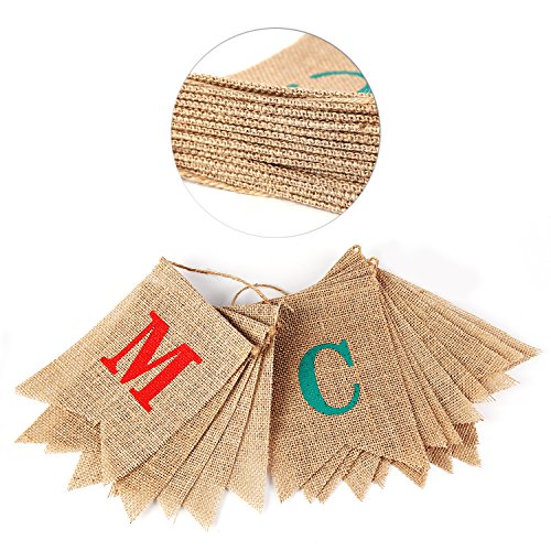 Feature: Material: burlap Size of each piece flag : 5.23*7.08inch MERRY strings measures length 6.56FT CHRISTMAS strings measures length 9.18FT 2 strings total length 15.7FT. Painted in REDGREEN spelled MERRY CHRISTMAS