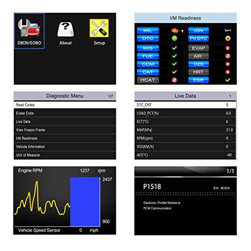The car computer diagnostic tester will read/erase engine fault codes and show the DTC definition on the screen. Quickly and efficiently troubleshoot the cause of check engine light and reset monitors. View Freeze Frame data. Show live data in the text and graph format.