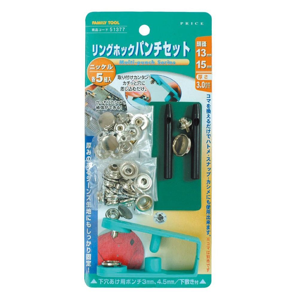 | 仕様 | 厚さ約3mmまで リングホック玉:頭径13mm・15mm(各5組入り) 下穴ポンチ3mm・4.5mm 下敷き・とらの巻き付き |