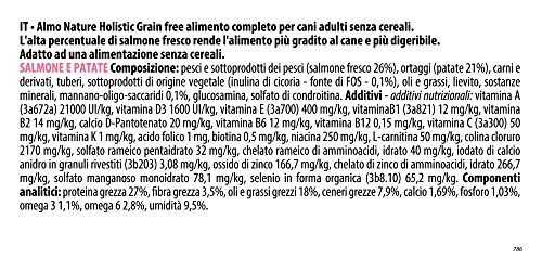 原材料:魚類(フレッシュサーモン26%、マグロ、アンチョビ)、野菜類(ポテト21%)、肉類(ポールトリー(鶏肉)、牛肉)、塊茎(タピオカ)、チコリから抽出イヌリン・フラクトオリゴ糖FOS 0.1%、鶏脂肪、イースト、ミネラル、マンナンオリゴ糖0.1%、グルコサミン、コンドロイチン硫酸塩
