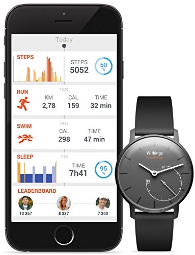 misst Schrittzahl, Entfernung und Kalorienverbrauch, Erkennung der Laufaktivität, Schlafanalyse, Aktivität beim Schwimmen, stiller Vibrationsalarm, Bluetooth Low Energy-Technologie, Kompatibilität: iOS 7 und höher, Android 4.3 und höher, Edelstahlgehäuse, Durchmesser 36,3 mm, Höhe 12 mm, wasserdicht bis 5 bar, schwarzes Silikonband, Dornschließe, anthrazitfarbenes Zifferblatt, weiße Zeiger