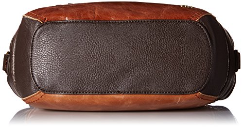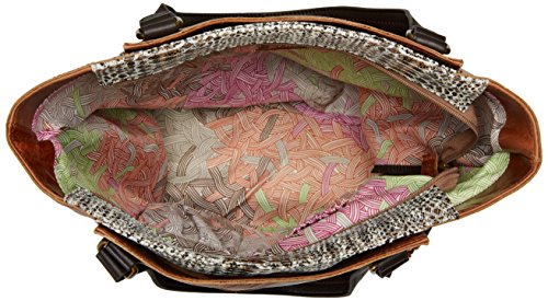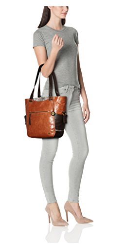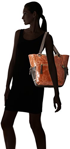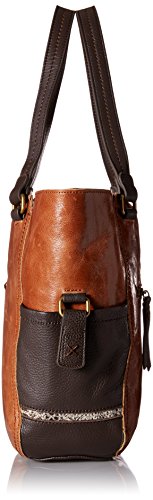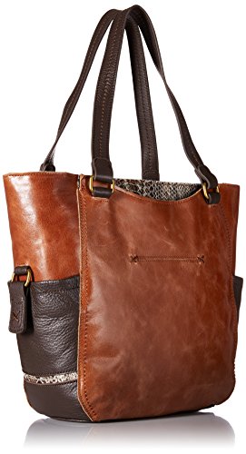 Leather tote with large front and back top slide pockets. Features The Sak wood mandala.