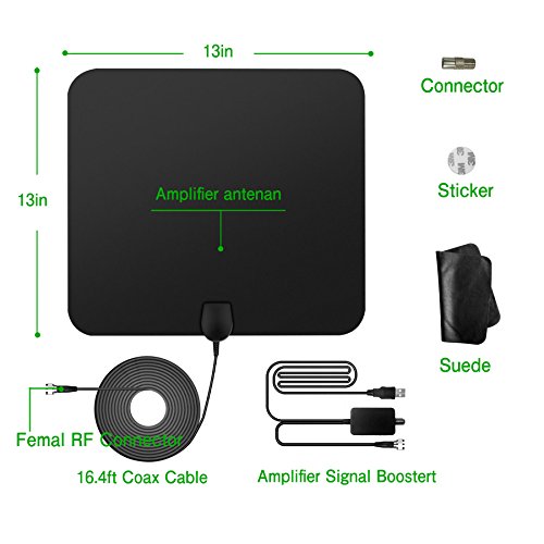 1 x Amplified TV Antenna with 16.5ft Coax Cable 1 x Signal Amplifier 2x Stickers Gift: Suede Cleaning Cloth to wipe the TV dusty