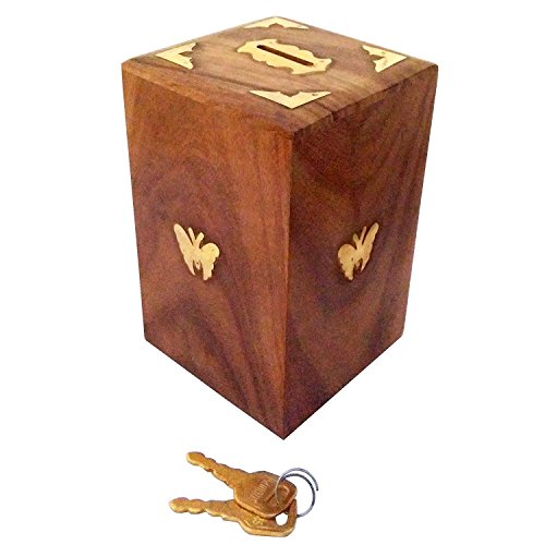 Father's Day Unique Gift Items Wooden Coins Storage Box,wooden piggy bank,Square Money Bank With Butterfly Inlay on two sides and Lock to store your money.