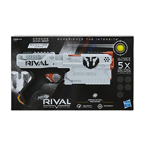 ReleaseDate : 2018-01-01 Studio : Hasbro Publisher : Hasbro Binding : Toy Product Description Phantom Corps is a group of rogue specialists who may join Team Red or Team Blue today, then challenge them tomorrow. Nerf Rival battles will never be the same! Go into battle as a member of the Phantom Corps team with the breech-loading Kronos XVIII-500 blaster that features the team’s identifying color and logo. Open the breech to load 5 high-impact rounds into the blaster, then prime it with the spring-action cocking mechanism, take aim, and fire! The blaster sends the rounds blasting into battle at 90 feet per second (27 meters per second). This Nerf Rival blaster also has a trigger lock, and tactical rail. It comes with red and blue flags that players can wear whenever they choose to join Team Red or Team Blue. Experience the intensity of Nerf Rival with the Nerf Rival Phantom Corps Kronos XVIII-500 blaster! Nerf and all related properties are trademarks of Hasbro. 0