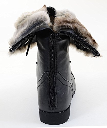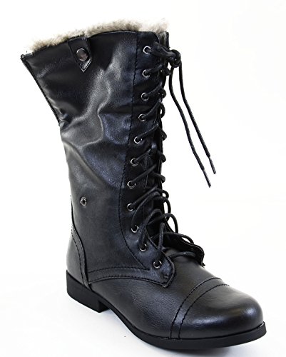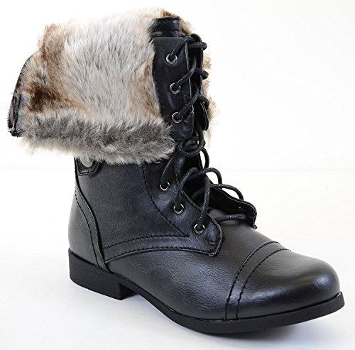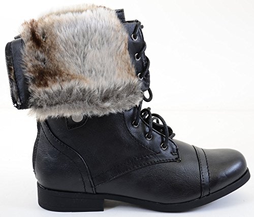 Binding : Apparel Product Description Stay stylish with these trendy military inspired combat boots. Featuring round toe, lace up front, snap button closure on sides for cuffed look, button decor on cuff, stitching detail, fur interior lining, low heel, and finished with a full back zipper and cushioned insole. May be worn tall or cuffed. 0