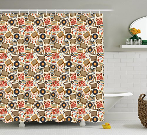 Vintage Shower Curtain by Ambesonne, Retro 60s 70s Radios Sets Music Bass Notes Antique Cartoon Image, Fabric Bathroom Decor Set with Hooks, 70 Inches, Cream Taupe Tan Dark Orange