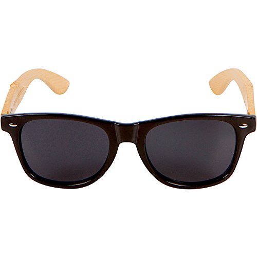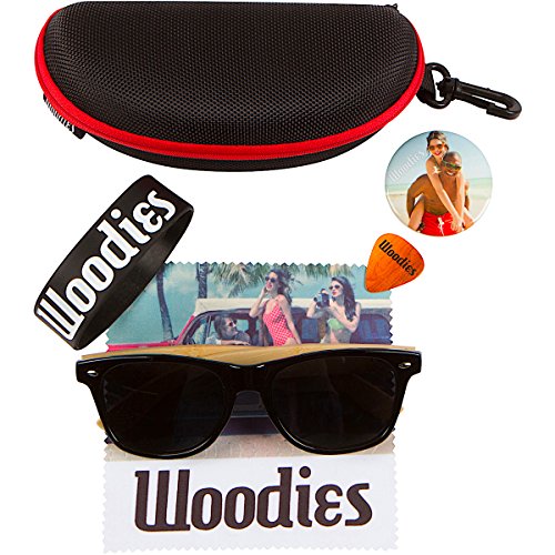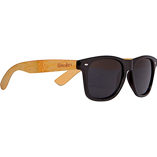 Product Description Woodies Bamboo Wood Sunglasses offer a combination of 100% real bamboo wood arms that support a wayfarer style plastic frame. The lightweight bamboo wood offers a comfortable fit that is durable and sturdy at the same time. Our unique stainless-steel, double-spring hinges are sturdy and designed to keep their shape year after year. The lenses are specially designed so that they are both dark and polarized, offering 100% UVA/UVB protection even in intense lighting conditions. These glasses are stylish, durable, and natural. Each pair includes a durable black carrying case, a microfiber lens cleaning cloth and a wood guitar pick! 30-Day Money back Guarantee 0