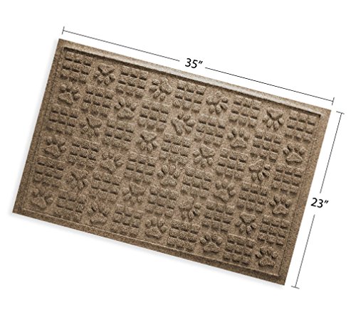 Ideal for areas with heavy foot traffic, the Bungalow Flooring Waterhog Standard Doormat protects your floors from water, mud, sand, snow and other elements. Its ribbed paw print and square design and exclusive "Water Dam" raised border traps dirt and absorbs moisture from shoes and pets to keep grime contained and your floors clean. Made from 24-ounce anti-static polypropylene, this 2-foot by 3-foot durable mat dries quickly and will not mildew, mold or rot. Featuring a commercial-grade, molded construction that will not crush or break down over time, the Waterhog Standard Doormat is highly resistant to extreme elements and suitable for indoor or outdoor use. Features a non-skid SBR rubber backing made with 20% recycled rubber that is environmentally friendly and certified slip resistant by the National Floor Safety Institute. For maintenance, simply hose clean or spot clean as needed and air dry. Made in the USA.