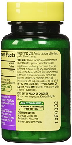 -. Binding : Health and Beauty -. Brand : Spring Valley -. EAN : 0681131312684 -. Feature : High Potency / Supports fat loss and promotes lean muscle mass. / Reduces high cholesterol levels. / Promotes sugar and carbohydrate metabolism. -. Label : Nutrition 21, Inc. -. LegalDisclaimer : The statements in this page have not been evaluated by the Food and Drug Administration. This product is not intended to diagnose, treat, cure or prevent any disease. -. Manufacturer : Nutrition 21, Inc. -. Model : SV31268 -. MPN : C04363 -. PackageQuantity : 1 -. PartNumber : C04363 -. ProductGroup : Health and Beauty -. ProductTypeName : HEALTH_PERSONAL_CARE -. Publisher : Nutrition 21, Inc. -. Studio : Nutrition 21, Inc. -. Title : Spring Valley - Chromium Picolinate 1000 mcg, 100 Tablets -. UPC : 681131312684