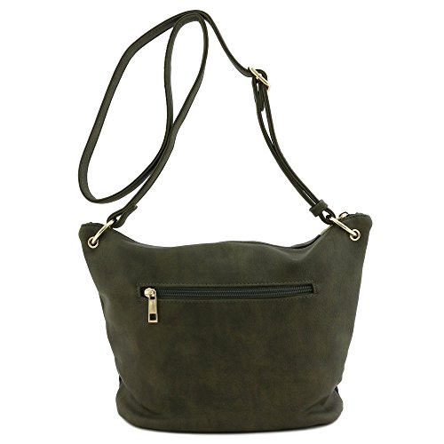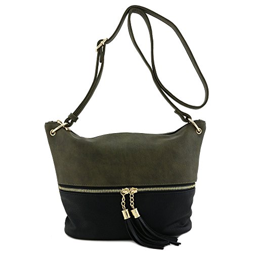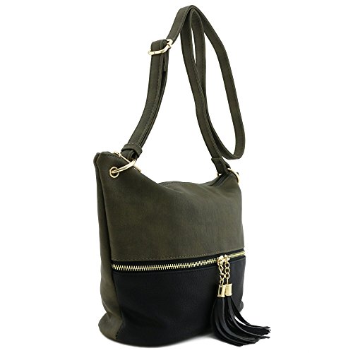This tassel accented zipper pocket medium size bucket crossbody bag makes easy to organize your everyday items.
