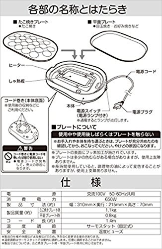 ●전원:AC100V(50/60Hz)●소비전력:650W●코드 길이:1.4m●튀김 국수나 야채부침도 OK♪평면 플레이트와 타코야끼기의 1대 2역할●타코야끼 플레이트혈1개의 직경:약4.0cm●일시에 20 개구이●평면 플레이트크기:폭26.5 (길이)깊이18cm●평면 플레이트,타코야끼 플레이트는 떼어 내어 통째로 세탁 가능●플레이트는 불소 수지 가공
