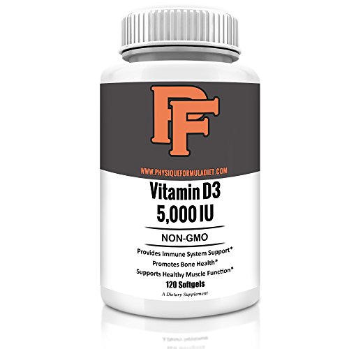 -. Feature : Physique Formula Vitamin D3 contains 5,000 IU in organic extra virgin and is NON-GMO to deliver you the best absorbing Vitamin D3 around without artificial junk. / Studies sest a positive relationship between higher blood levels of Vitamin D and lower risks of certain cancers. / Up to 60% of people living in the United States are estimated to be definicient in Vitamin D. Vitamin D3 Supports Muscle, Bone, Breast, Prostate & Immune System Health / NON-GMO, gluten, soy, whey and nut free! Backed by our iron glad 100% money back guarantee. / Vitamin D3, according to studies, promotes healthy muscle function and recovery from intense activity.