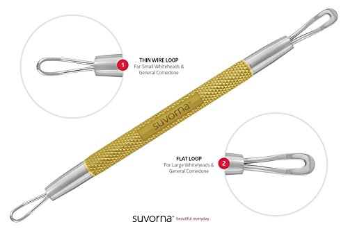 - SAFE EASY AND EFFECTIVE MULTI PURPOSE EXTRACTOR: Suvorna’s extractor with different size loop on each end is easily used to remove blemishes such as whitehead, pimples, blackhead and general comedones. This tool provides a perfect mix of thin wire loop for small whiteheads, blackhead and flat loop for larger ones. Extractor works effectively on nose, chin, forehead, cheeks and body acne, also has the ability to remove blemishes deep in the skin.
