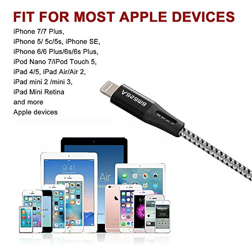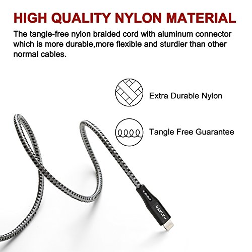 ♠ Fast Charge and Data Transmission ♠ Superior quality copper transmission cables ensure syncing and charging simultaneously with high speed on your lightning devices. Save your precious time from boring waiting. ♠ Super Sturdy ♠ Well-built cables, no more worries about cables getting snapped or broken. The inside high-quality copper wires increase durability, and outer jacket helps to protect the cable from damage and fraying. Our cables have passed 5000 bends test. They are more durable and sturdy than normal 8 pin lightning cables. ♠ Comfortable and Convenient ♠ The body jacket is made of tangle free nylon braided material, high quality and environmental friendly. Artificial fiber gives it a soft and silky feeling. Black and grey give it a faddish and fancy appearance. Braided structure gives it an elaborate and exquisite outlook. At 6FT/2M long, these cables are convenient to use while in bed, a sofa, a car, or office. Allow your random movement far away from the power source without the bother of radiation, and connect your phone, tablet or other Apple devices farther than ever. No longer be stuck to wall socket, make your life more convenient. ♠ Compatible with ♠ iPhone 7 / 7 Plus / 6s Plus / 6s / 6 plus / 6 / 5s / 5c / 5 / SE iPad 4 / 5 / Air / Air 2 / Pro / mini / mini 2 / mini 3 / mini 4 iPod Touch 5 / 6 / nano 7 ♠ What you get ♠ 3 Pack 6 Feet nylon braided lightning cables and our sincere custom service