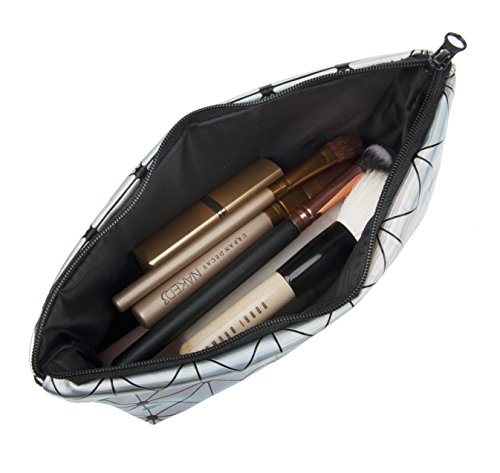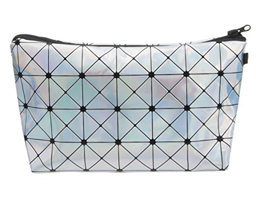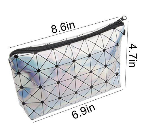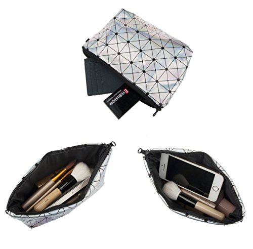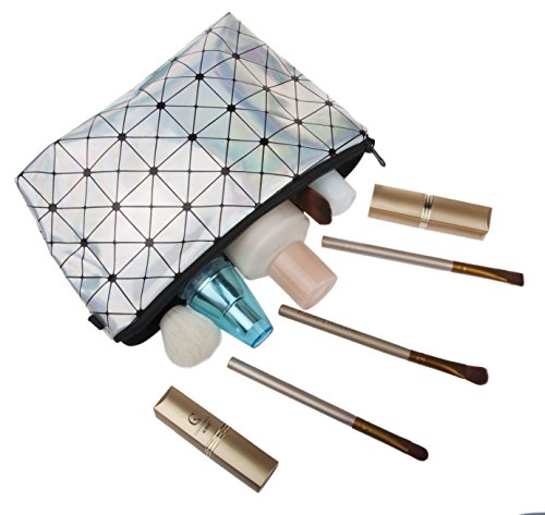 Vercord Handy Makeup Cosmetics Bag Pouch Waterproof PU Leather Portable Soft Surface Laser Cosmetic Bag Holder, Diamond Silver