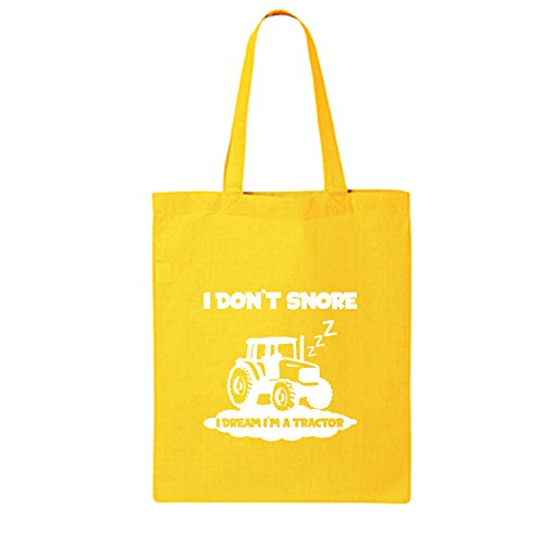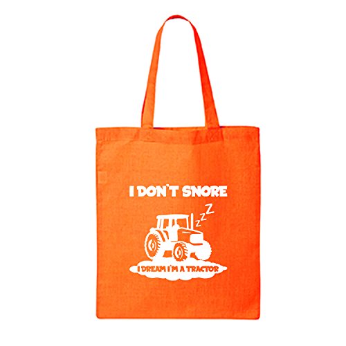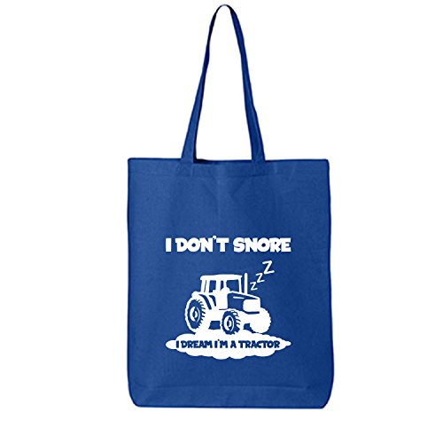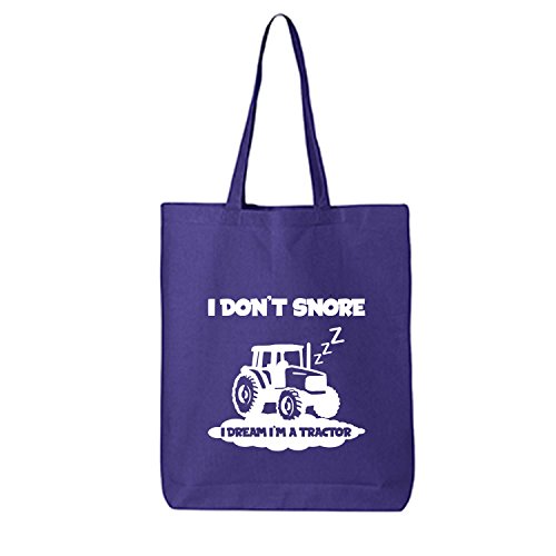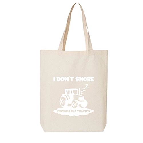 Product Description This cotton canvas tote bag features "I don't snore I dream I'm a Tractor" on the front. 15" Wide x 16" High x 3" Deep with 20" handles. Printed in the USA on an imported bag. 0