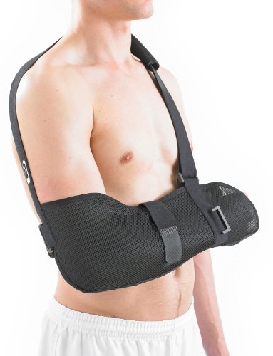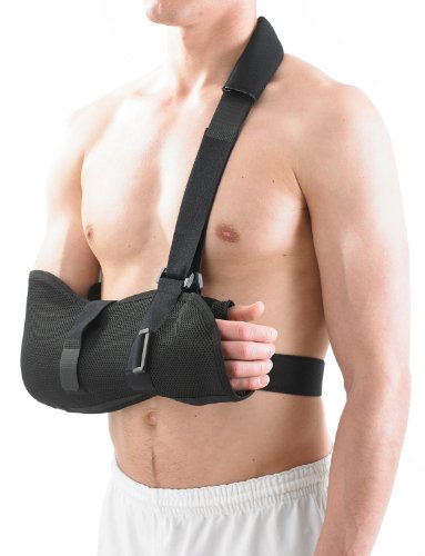 "The Neo G Airflow Breathable Arm Sling is adjustable and constructed from breathable fabric for maximum comfort and control. It can be used for right or left arm/shoulder injuries and works by helping immobilize the shoulder and collar bone joints to aid a comfortable healing position to allow joint and soft tissue recovery. Useful in rehabilitation, it helps reduce stress around the arm/shoulder complex and helps encourage correct alignment of the joint for healing by stabilizing the forearm against the body.Feature