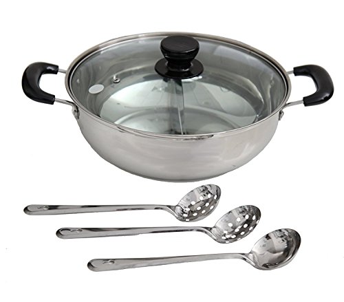 BEST ON THE MARKET Stainless exterior - fast and easy to clean, Stainless interior for easy cooking and easy clean up Stainless construction, Venting tempered glass lids Even heat base, Delivers even heat distribution for reliable cooking results work on induction stove( must be flat surface) The package included one 30cm hot pot with S shape Separate Bottom Bonus 3 spoon as shown in pictureFeature