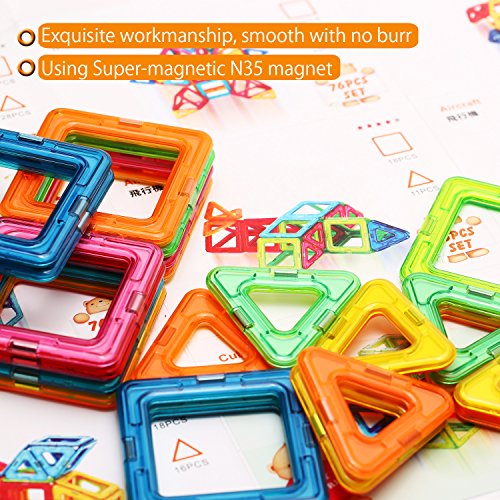 ★FULL OF FUN: Our 76PCS magnet blocks set which comes in rich gameplay that appeal to boys and girls of all ages, Including 50*triangle, 26*square, Can be assembled into Many patterns, such as: Train, Airplane, Cat, House, Round ball, Five-pointed star and more. (Our 76PCS blocks are all pure magnets, no plastic letter cards or digital cards to make up the numbers.)