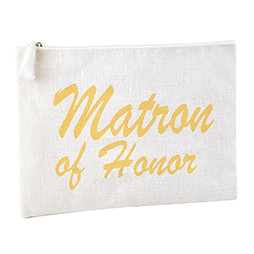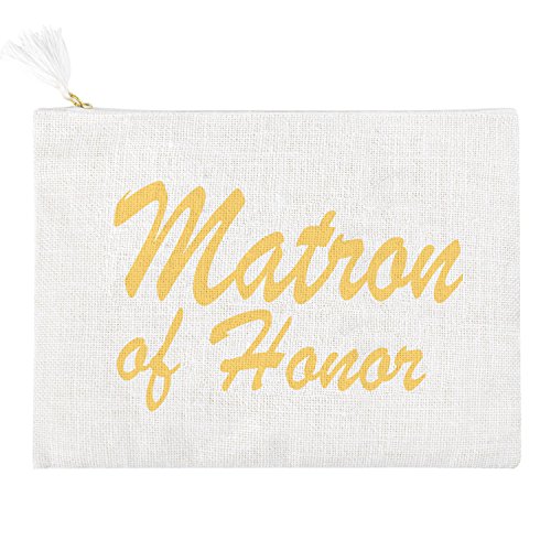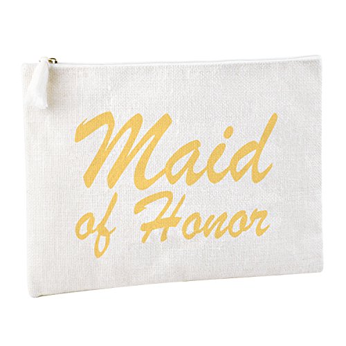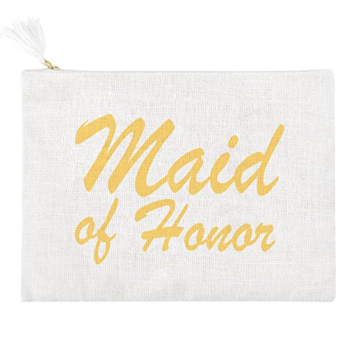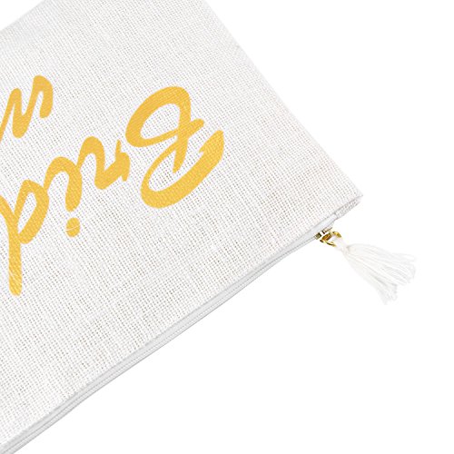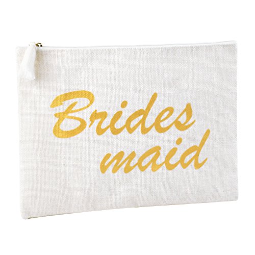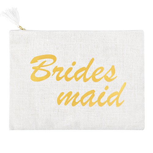 "Bridesmaids" printed with gold script. All time classy and elegant, absolute stylistic gift choice to bride. Perfect wedding day bag with interior pocket to carry all of the essentials, including the interior pocket for small accessories .