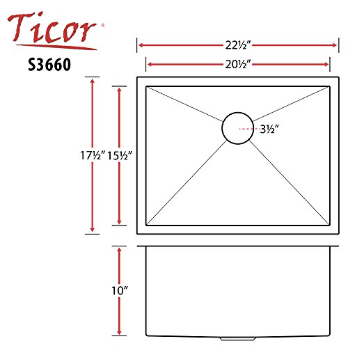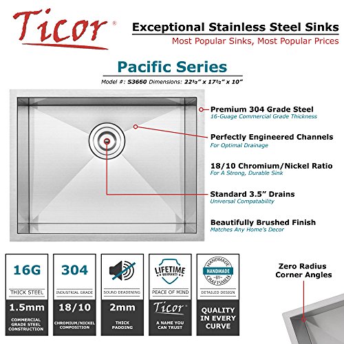 22-1/2" Ticor S3660 Pacific Series 16-Gauge Undermount Stainless Steel Single Bowl Zero Radius Square Kitchen Sink with Accessories