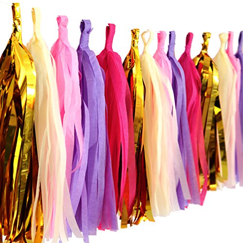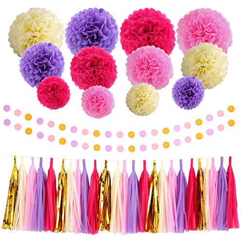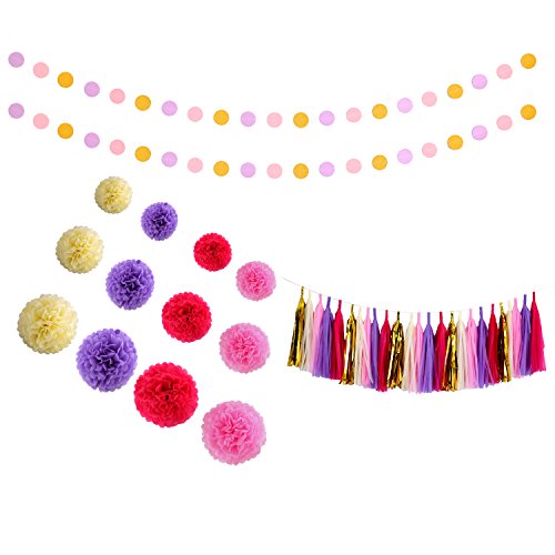 - Package includes :12pcs tissue paper flowers,25 pcs tissue paper tassels garland (Rose Red, Lovely Pink, Purple,Cream,Gold,each color comes with 5 pcs)and 2 pcs circle dot paper garland . Total 39pcs party decorations.