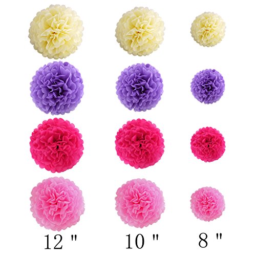 - Product size :3pcs Rose Red Paper flowers (1*8''+1*10''+1*12")+3 pcs Lovely Pink Paper flowers (1*8''+1*10''+1*12")+3pcs Purple Paper flowers (1*8''+1*10''+1*12'')+3 pcs Cream Paper flowers (1*8''+1*10''+1*12''),each tassel is about 14 inch long after assembled,circle dot paper garland length about 79 inch.