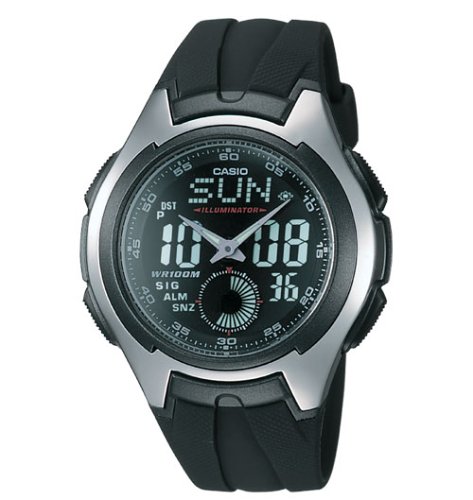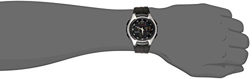 A great choice for sporty world travelers, this Casio analog-digital stainless steel watch offers a stylish black sports resin band that will stay comfortable during your most active sport outings. The round silver stainless steel watch case features a black bezel framing a black dial face with dagger-style hands and small Arabic numeral display with small minute indexes. The center of the face sports a large digital readout that provides a view to a second time zone--a great feature for globetrotters. It offers an integrated world time function with 29 time zones (27 cities), city code display, and daylight saving on/off. Other timekeeping features include: