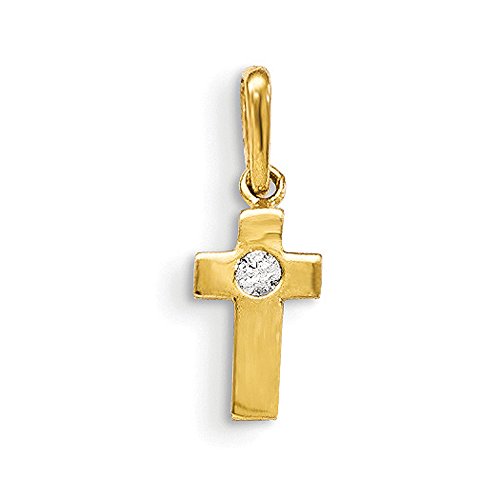 -. Binding : Jewelry -. Brand : The Black Bow -. Color : Yellow -. Department : girls -. Feature : Polished 14k yellow gold design / Bezel set with a single CZ gemstone / Approximate size 5 x 16mm with the bail / Weight is Approximately 0.19 grams / Includes our custom gift box -. Label : The Black Bow -. Manufacturer : The Black Bow -. MPN : P12028 -. NumberOfItems : 1 -. PackageQuantity : 1 -. PartNumber : P12028 -. ProductGroup : Jewelry -. ProductTypeName : FASHIONNECKLACEBRACELETANKLET -. Publisher : The Black Bow -. Studio : The Black Bow -. Title : Tiny Children's Cubic Zirconia Cross Pendant in 14K Yellow Gold