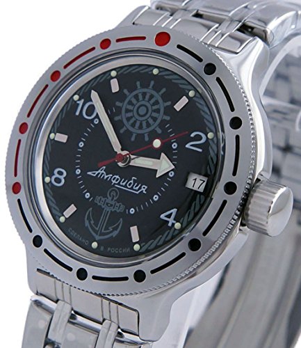 -. Feature : Watch of official supplier of the Defense Department of the Soviet Union / 200 m (660 feet) Water Resistant / Automatic VOSTOK self-winding movement 2416B with 31 ruby jewels (no hands winding required, but watch can still be wound up with winding stem if it has not been worn for some time). Fully wound watches run at least 31 hours. / Anti-shock (shock resistant) balance, Central second hand, Graduated rotated bezel / Luminous hands and markings