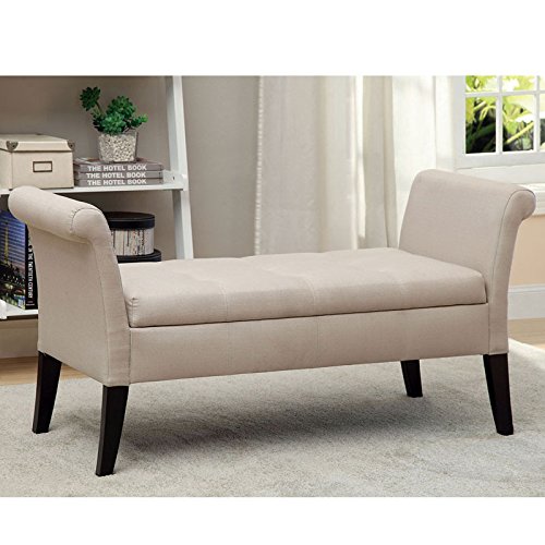 -. Feature : Materials: Wood, Fabric / Storage Space / Curved Arms & Legs / Large Bench: 54" W x 17.75" D x 26.25" H / SEAT HT: 17.5", SEAT DP: 17.75" / Assembly required