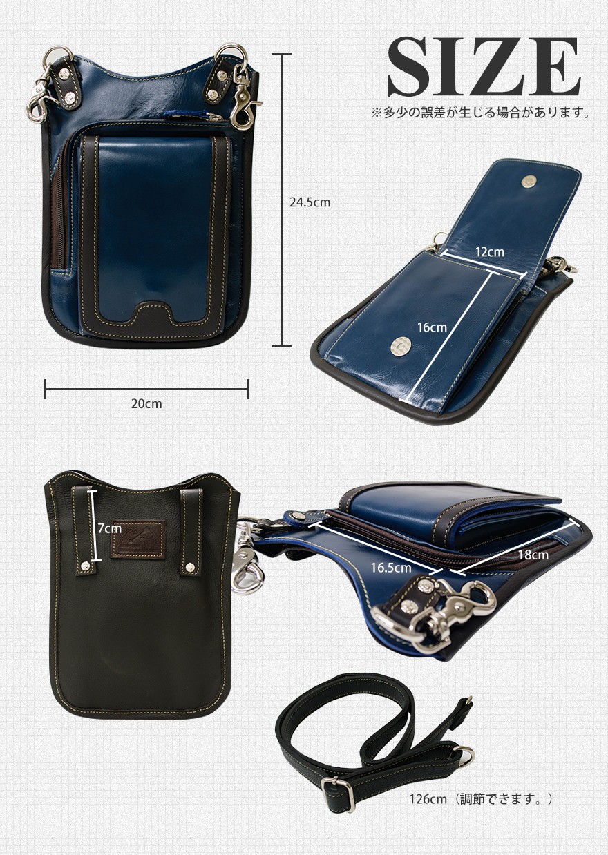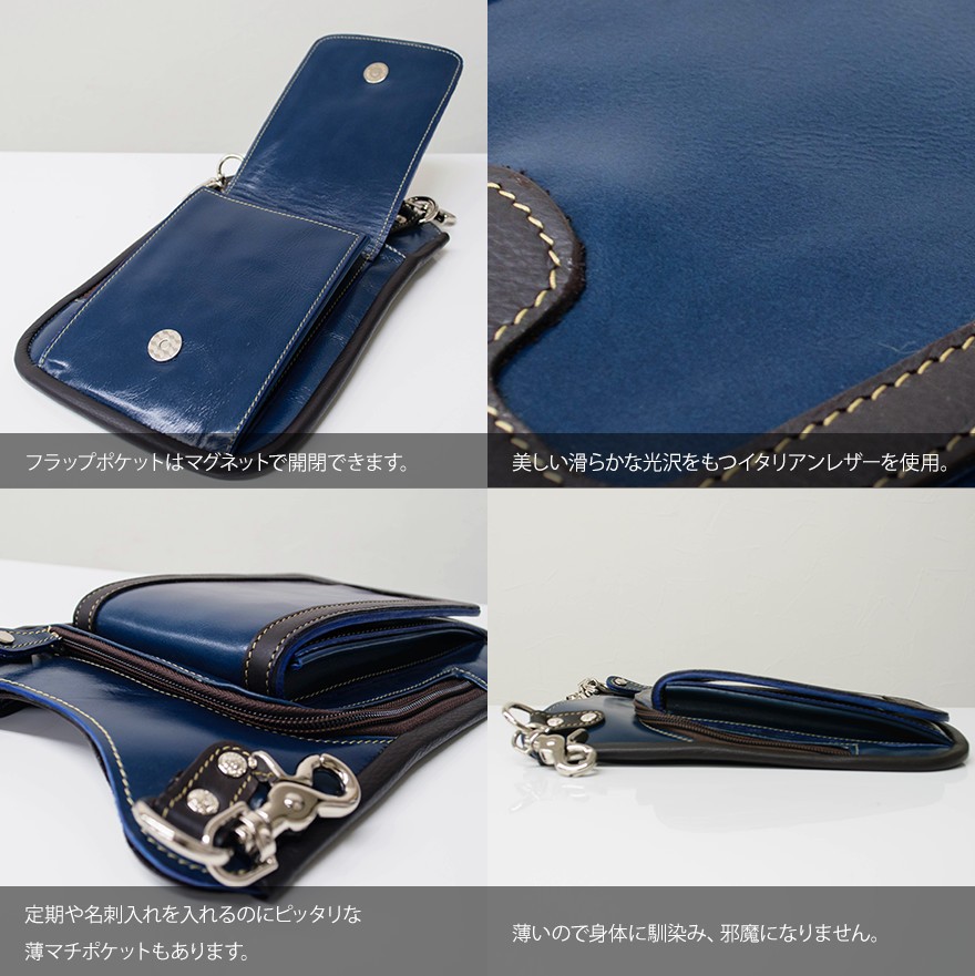 Deep Zone ワイルドでセクシーを上品にまとめる男のヒップバッグ自分買いからプレゼントにも人気。一流革職人がハンドメイドで仕上げらてた 本革ヒップバッグ&ショルダーバッグ。【素材】 牛革 【サイズ】 高さ=約24.5Cm 幅=約20.0Cm 【カラー】 ネイビー【詳細】光沢のある重厚な牛革を丹念に作り込まれたショルダーバッグ&ヒップバッグ!手作り感溢れる雰囲気を持つ仕上がり!ショルダーベルトをはずしてフックをベルトループに着用できヒップバッグとして腰回りをオシャレにします。バッグ上部のポケットは大きく開口し普段持ち歩く財布、スマートフォン、車のキーや手帳、等の小物を収納してスタイリッシュに持ち運びできます。 ワイルドさと絶妙なシンプルさが兼ね備わったレザーヒップバッグ 使い込むほどに渋味が出て末長く愛用出来ます。| こちらの商品の色違いはコチラです。 |