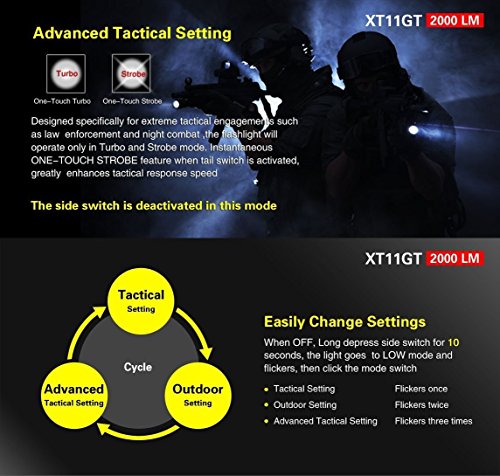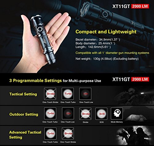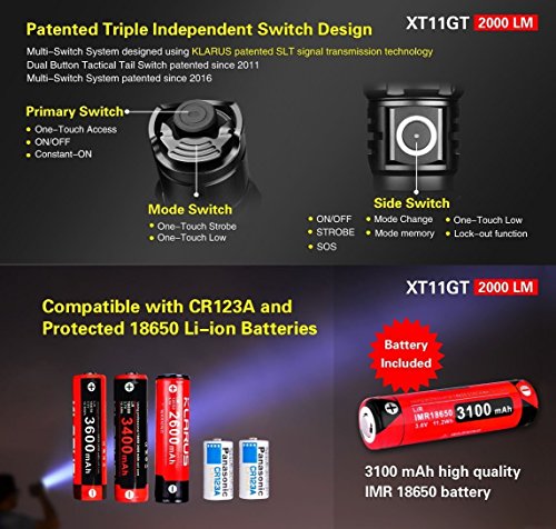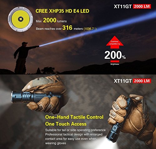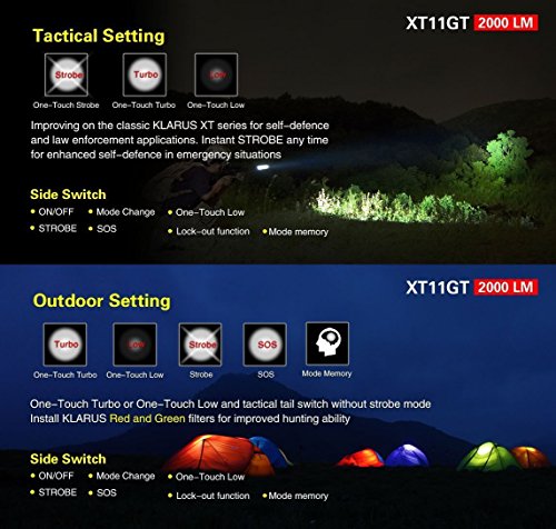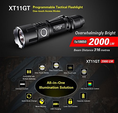 4th Generation KLARUS Tactical Flashlight. Compact design; superb functionality; industry leading patented features.Newest CREE XHP35 HD E4 LED, 2000 Lumen Max Turbo output; beam reaches over 316 meters; industry leading performance