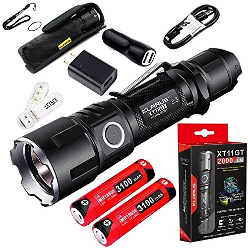 SKYBEN Klarus XT11GT 2000 Lumens CREE XPH35 HD E4 LED 18650 Tactical USB Rechargeable Flashlight with 2 x 3100mah Battery,Car Charger, Wall Adaptor and USB Light