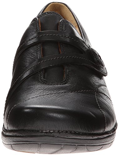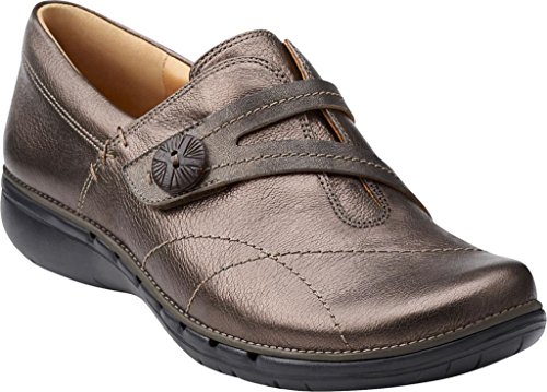 Leather slip-on featuring split vamp strap with button, arch support, and moisture-control ACS technology