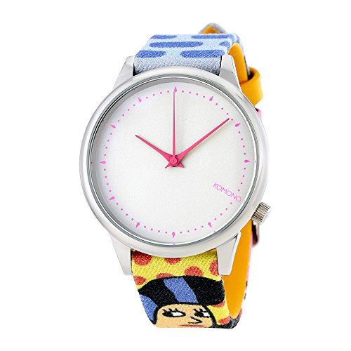 Studio : Komono Publisher : Komono Binding : Watch Product Description Silver-tone metal case with a multi-color print leather strap. Fixed silver-tone bezel. White dial with pink hands and index hour markers. Minute markers around the outer rim. Dial Type: Analog. Quartz movement. Scratch resistant mineral crystal. Pull / push crown. Solid case back. Case diameter: 36 mm. Case thickness: 8.5 mm. Round case shape. Band width: 12 mm. Tang clasp. Water resistant at 30 meters / 100 feet. Functions: hour, minute, second. Casual watch design. Komono Her By Andy Rementer Unisex Watch W2402. 0