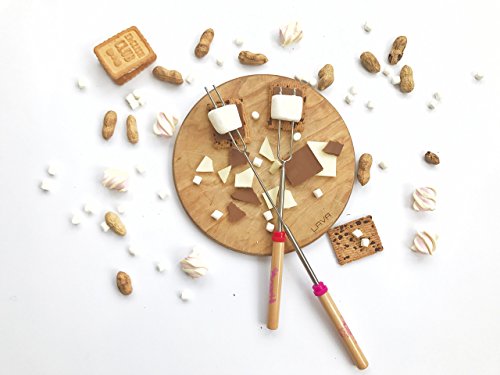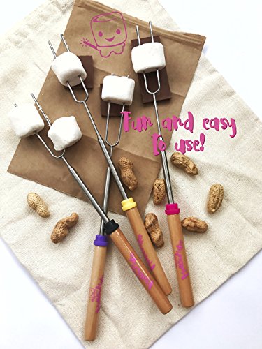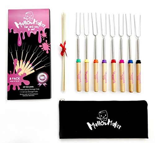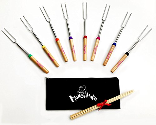 Premium Marshmallow Roasting Sticks 32-Inch Set of 8 Smores Skewers & Hot Dog with durable canvas carrying case and 8 cool bamboo kebab skewers. By Mallowmaker