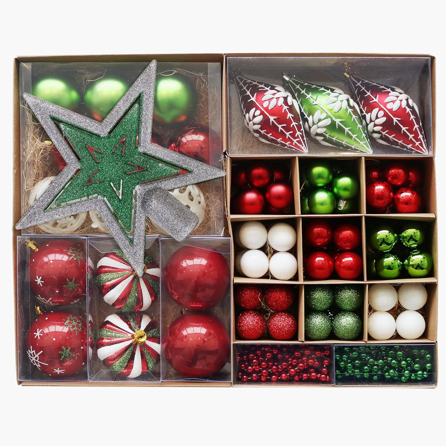 ▼豪華な90個セット・20種類大集合!!これだけの高級オーナメントを単品で購入すれば、あれこれ悩む必要もなく、お手持ちのツリーを華やかになります。 ▼定番的で独特な設計:赤&緑&白&銀を融合とした伝統色でのオーナメントセットは、クリスマスツリーやお部屋を飾るオブジェにピッタリ! ▼イルミネーションと一緒に飾ればキラキラと美しく反射して、クリスマスの雰囲気が抜群。 ▼当店のほかの赤&緑&白&銀シリーズのオーナメントと一緒にツリーを飾ると、もっと効果的になります。 ▼セット内容:「トップスター」×1、「3cmボール」×69、「6cmボール」×9、「7cmボール」×4、「玉葱」×2、「ビーズガーランド」×2、「フィニアルオーナメント」×3。“S”字のメタルフックを付属します。