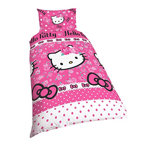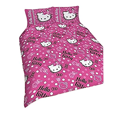 Please note: This product is a UK import, this duvet cover supplied is slightly smaller than the standard US duvet size, it will fit but the duvet may fold at the edge when covered. This is not a comforter but a cover for a duvet. Girls reversible bedding set with Hello Kitty branding. Features floral and polka dot design. Single duvet size: (approx) 53in x 79in. Double duvet size: (approx) 79in x 79in. Pillowcase: 19in x 29in. One pillowcase with single size, two with double size. 50% Polyester, 50% Cotton. Machine washable.Feature