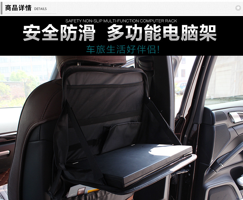 安装在汽车座椅后背上的可折叠的小桌,便于在桌上放置物品,可充当电脑桌,餐桌。也可在桌上书写,记笔记等,用途广泛,适用于任何款式的车。可折叠,折叠后的汽车桌紧贴座背后侧,不占用车内空间。非常适合驾车外出旅游,商务办公,休闲之用,也很适合自家车出游用,尤其有小孩的家庭。是人们驾车外出的商务、旅游、休闲之必备用品。