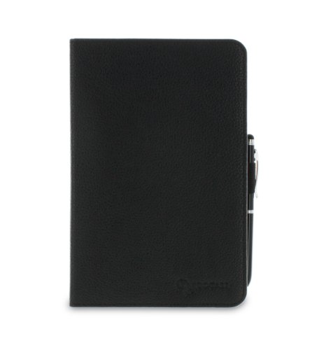 Magnetic front lid with auto wake / sleep cover. Elastic loop for pen or stylus. 3n1 capcitive stylus with ballpoint pen.